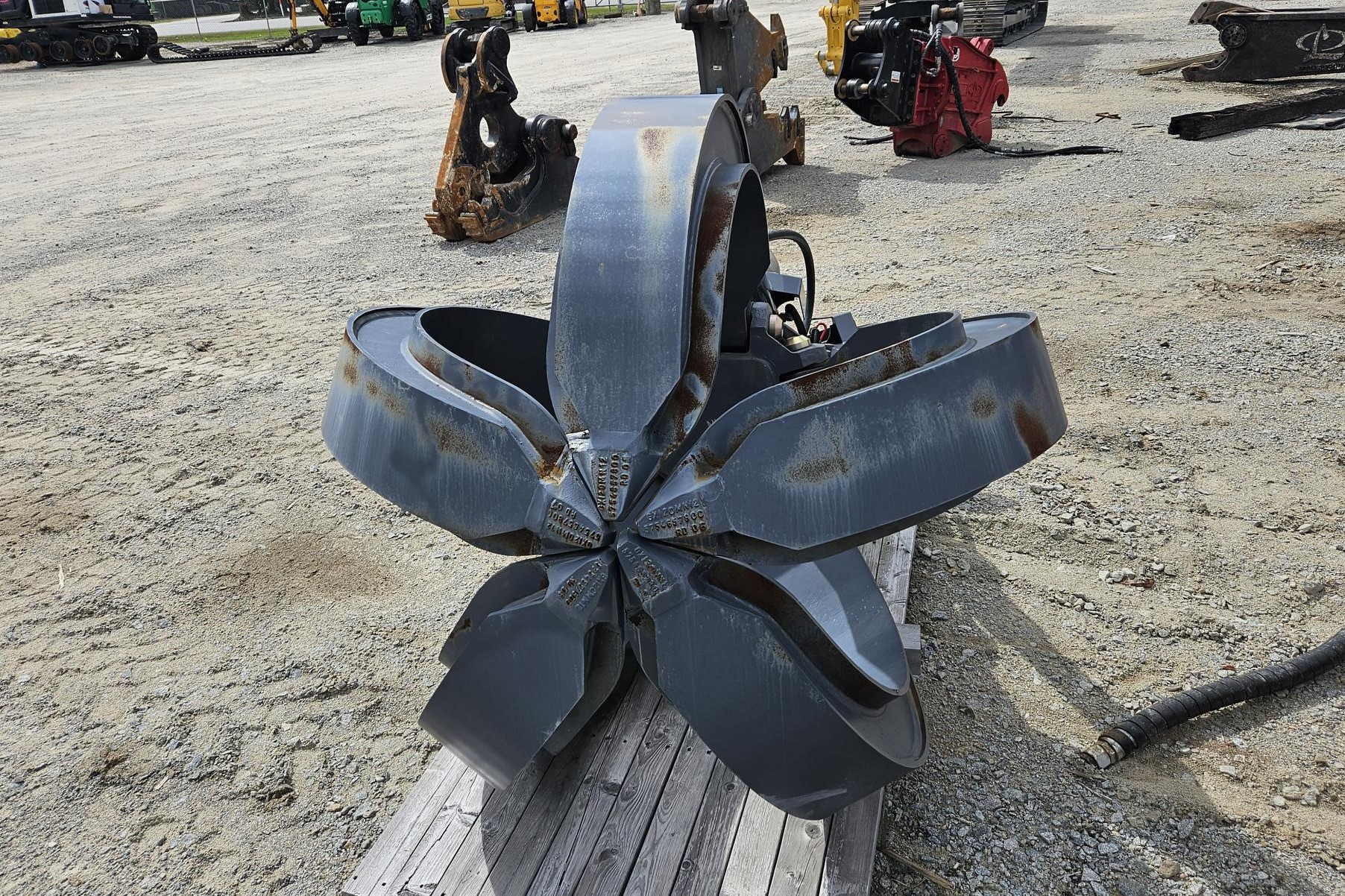 Location: FRANKFORT, KYOrange Peel Scrap Grapple, 5-Tine, 0.78cuyd, 55in Closed Width, 93in Opening Width, 82in Closed Height, 8,093lbf Peak Force, 18,475lb Load Capacity, 3,296lb Grapple Weight. Placed Into Service In 2025.