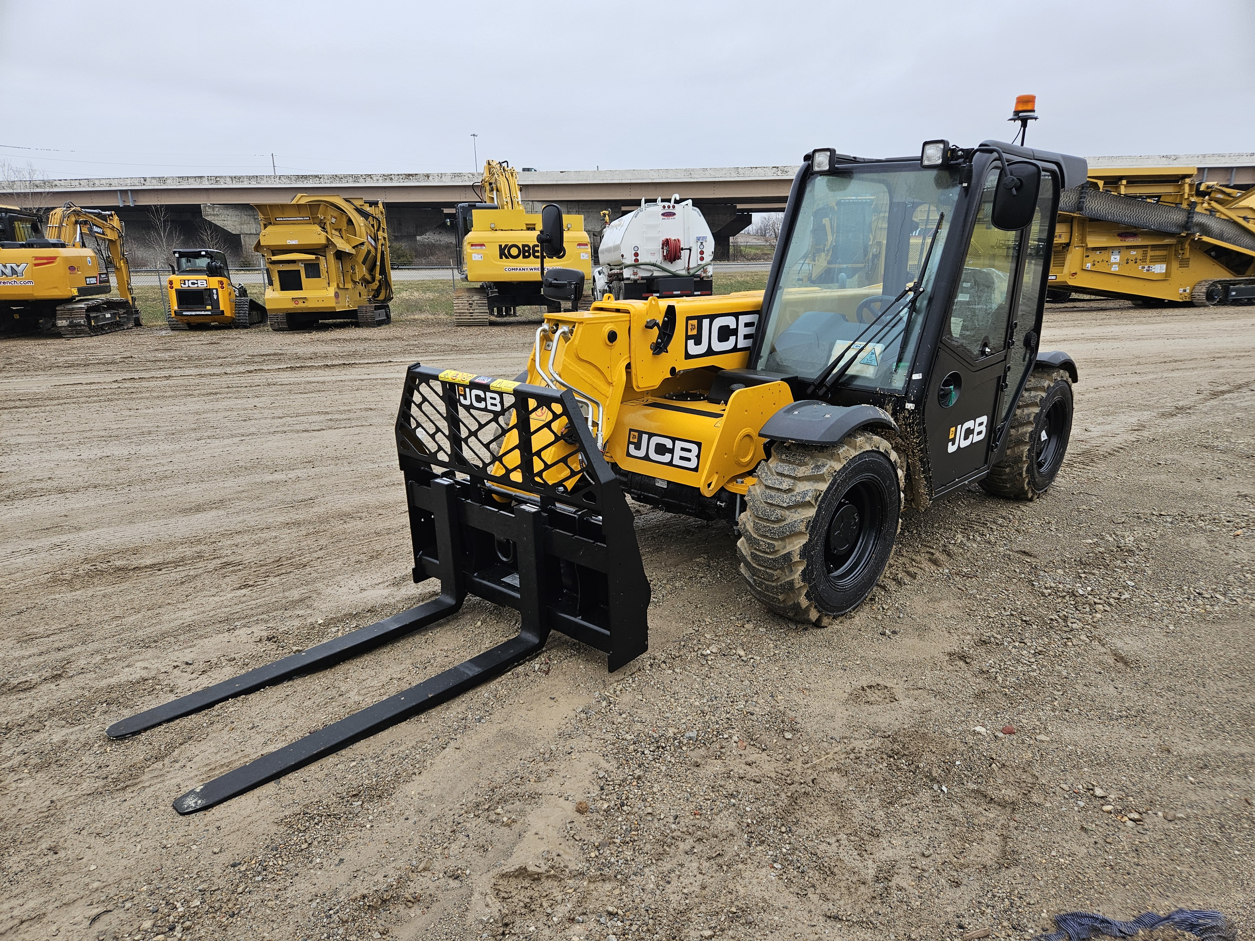Base Unit, 74hp JCB Diesel by Kohler Engine, Basic Cab with A/C, 5,500lb Max. Lift Capacity, 20ft Max. Lift Height, Single Lever Joystick, Front Work Lights, Face Level Fan, Cloth Suspension Seat, LED Strobe Beacon, Hydraulic Pin Locking Skid Steer Carriage, 12-16.5 Galaxy Tires.