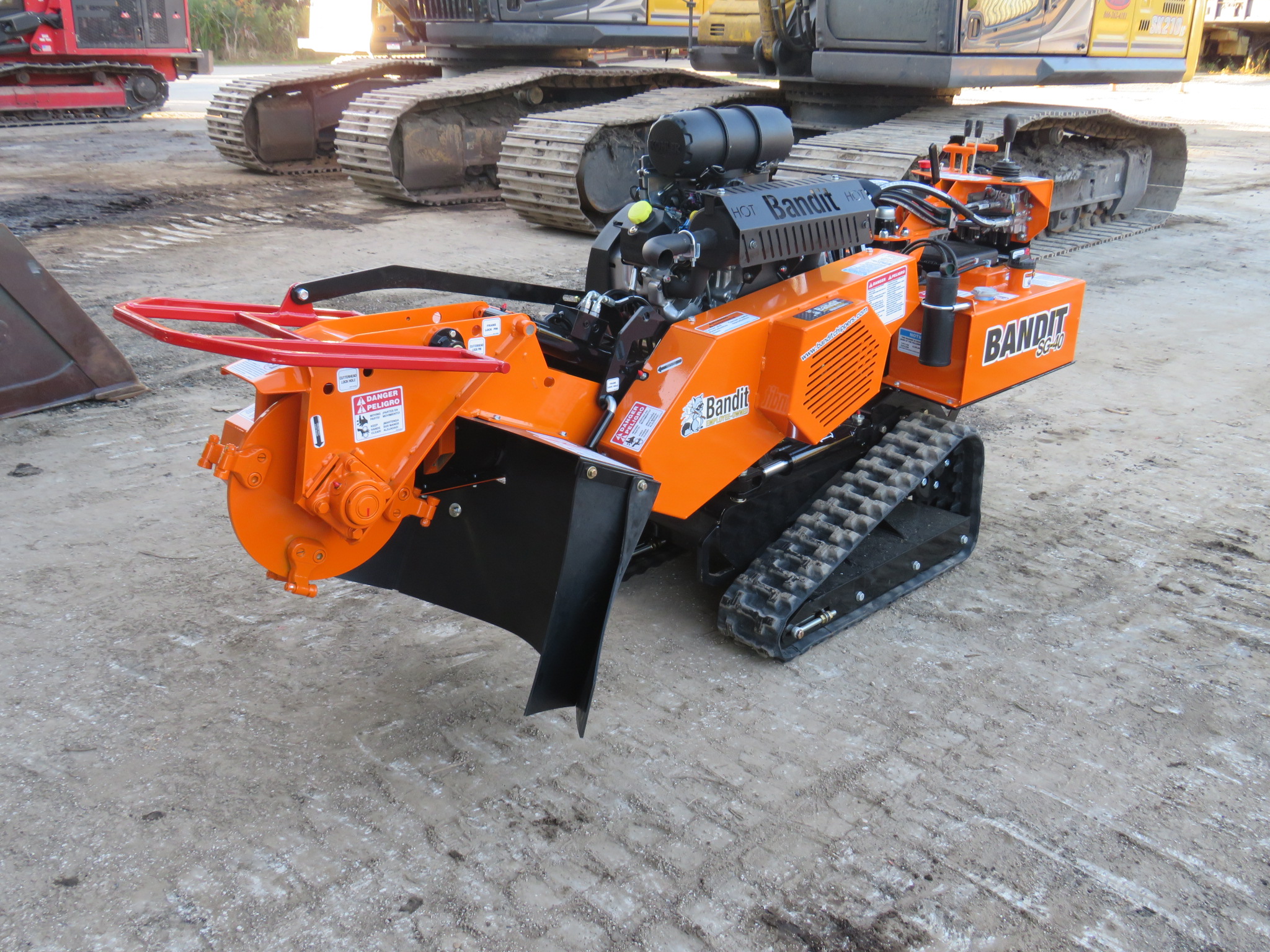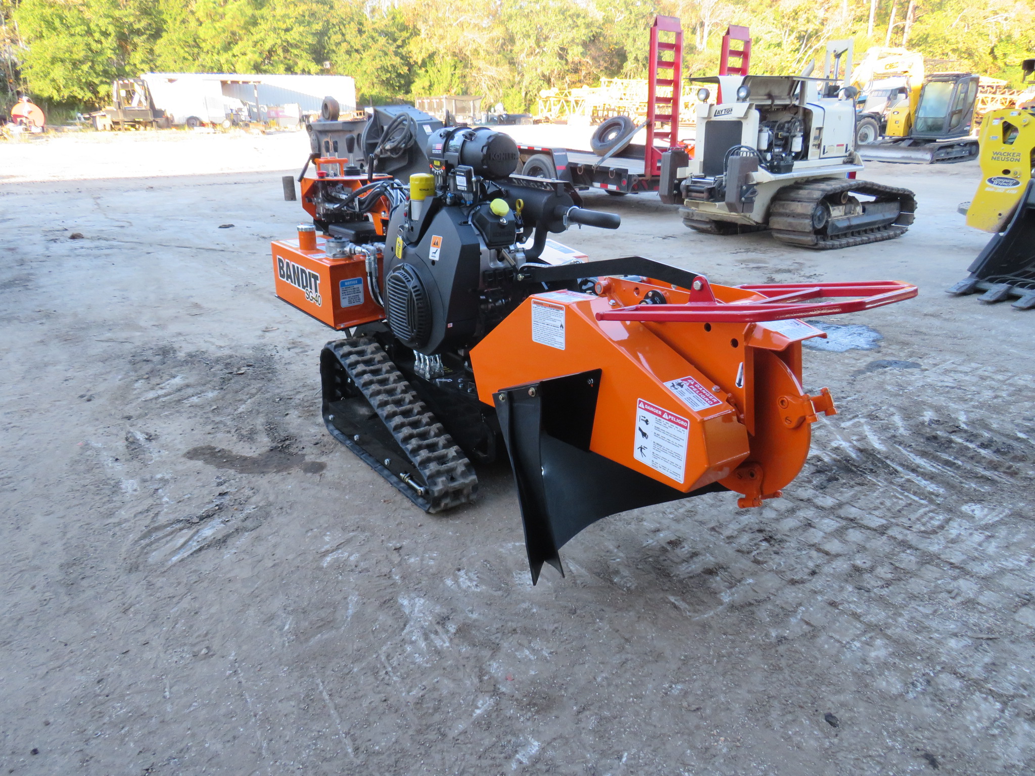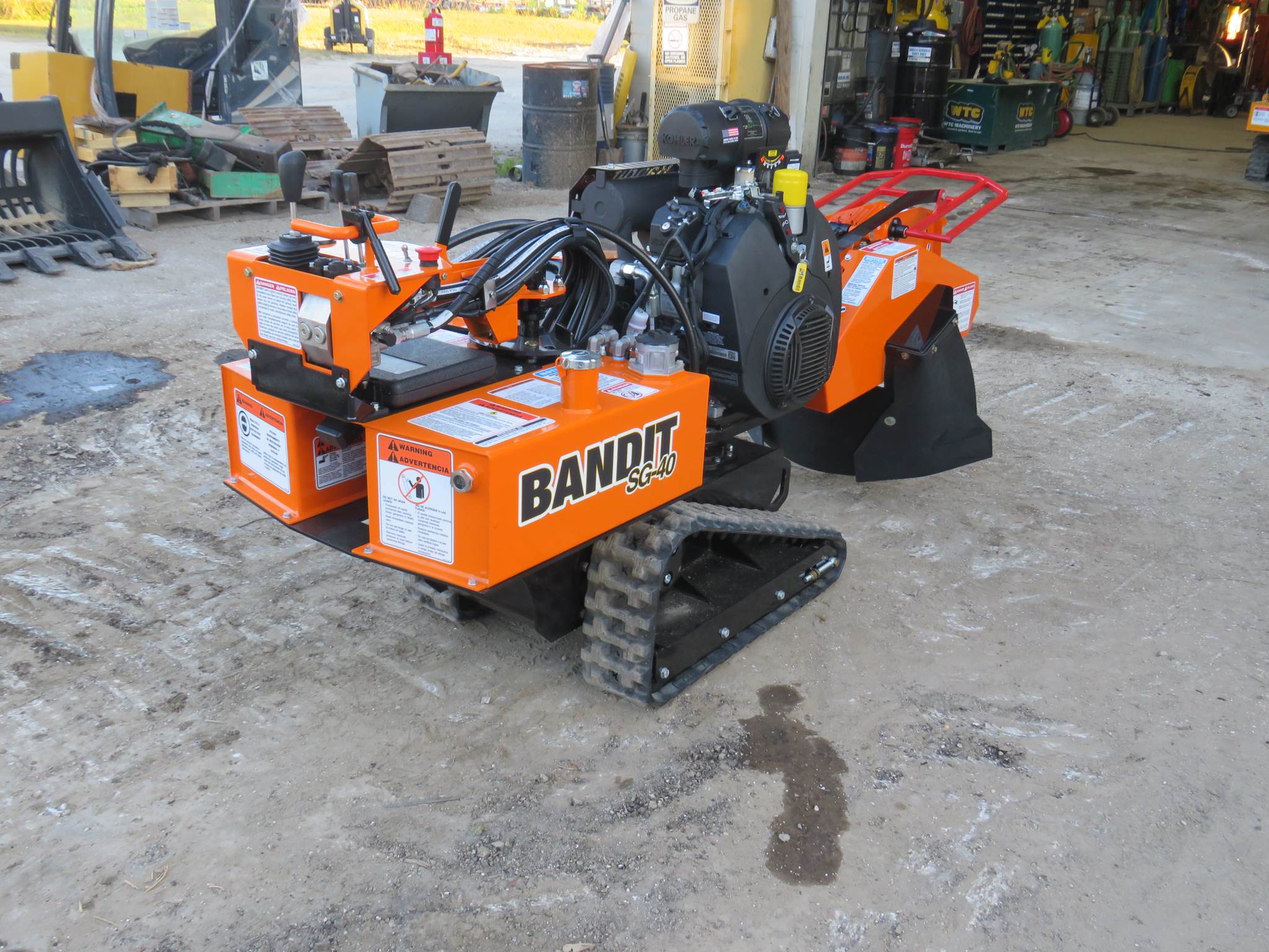 Bandit SG-40 Tracked Stump Grinder, 38hp Kohler Gas Engine, 18in Diameter x 1/2in Thick Belt Driven Green Tooth Cutter Wheel With 8 Teeth, 44in Cutting Swing, 12in Cutter Wheel Depth, 22in Cutter Height, 7-Gallon Fuel And Hydraulic Tank, Pivoting Control Panel, Painted Bandit Orange.