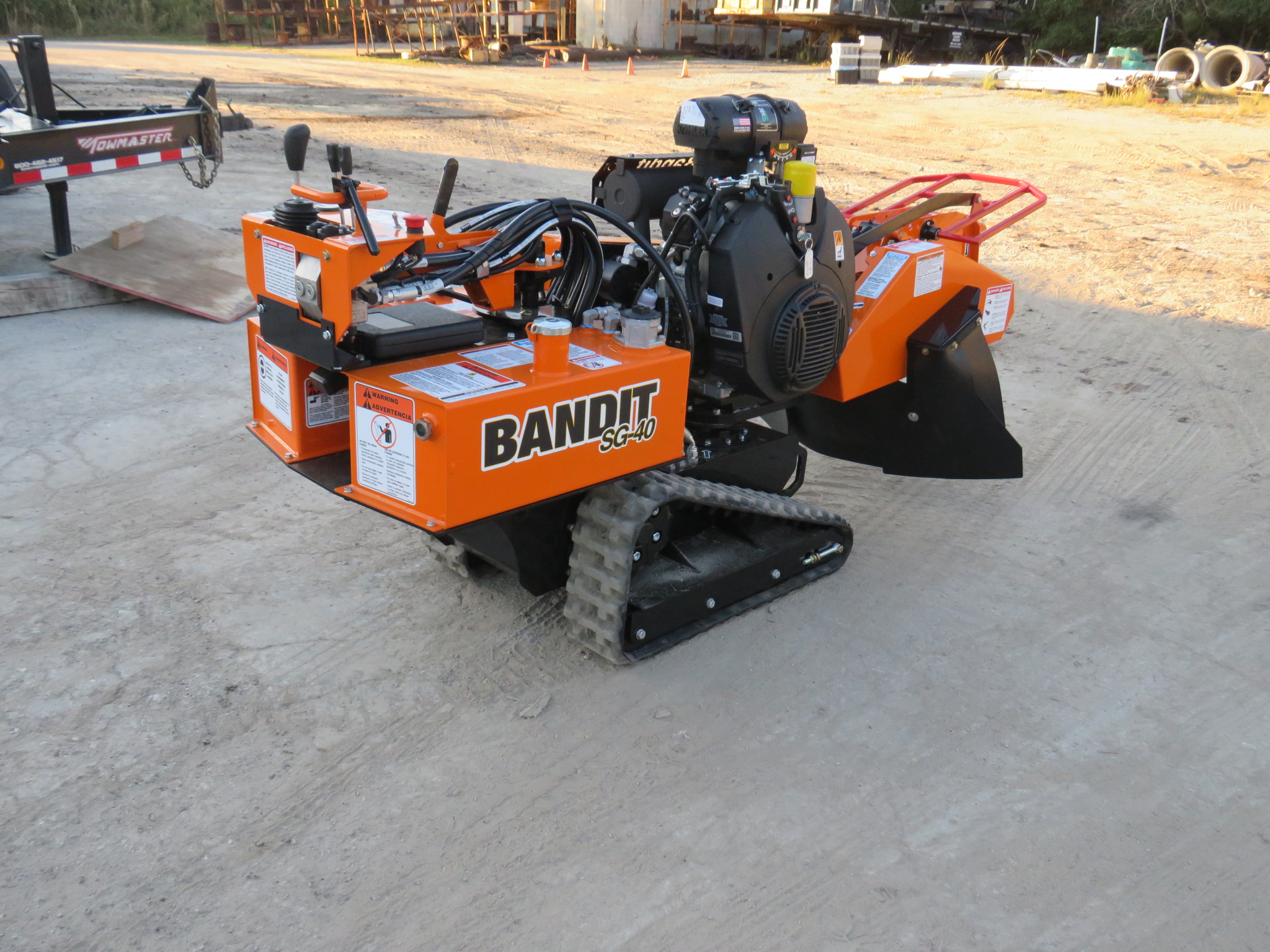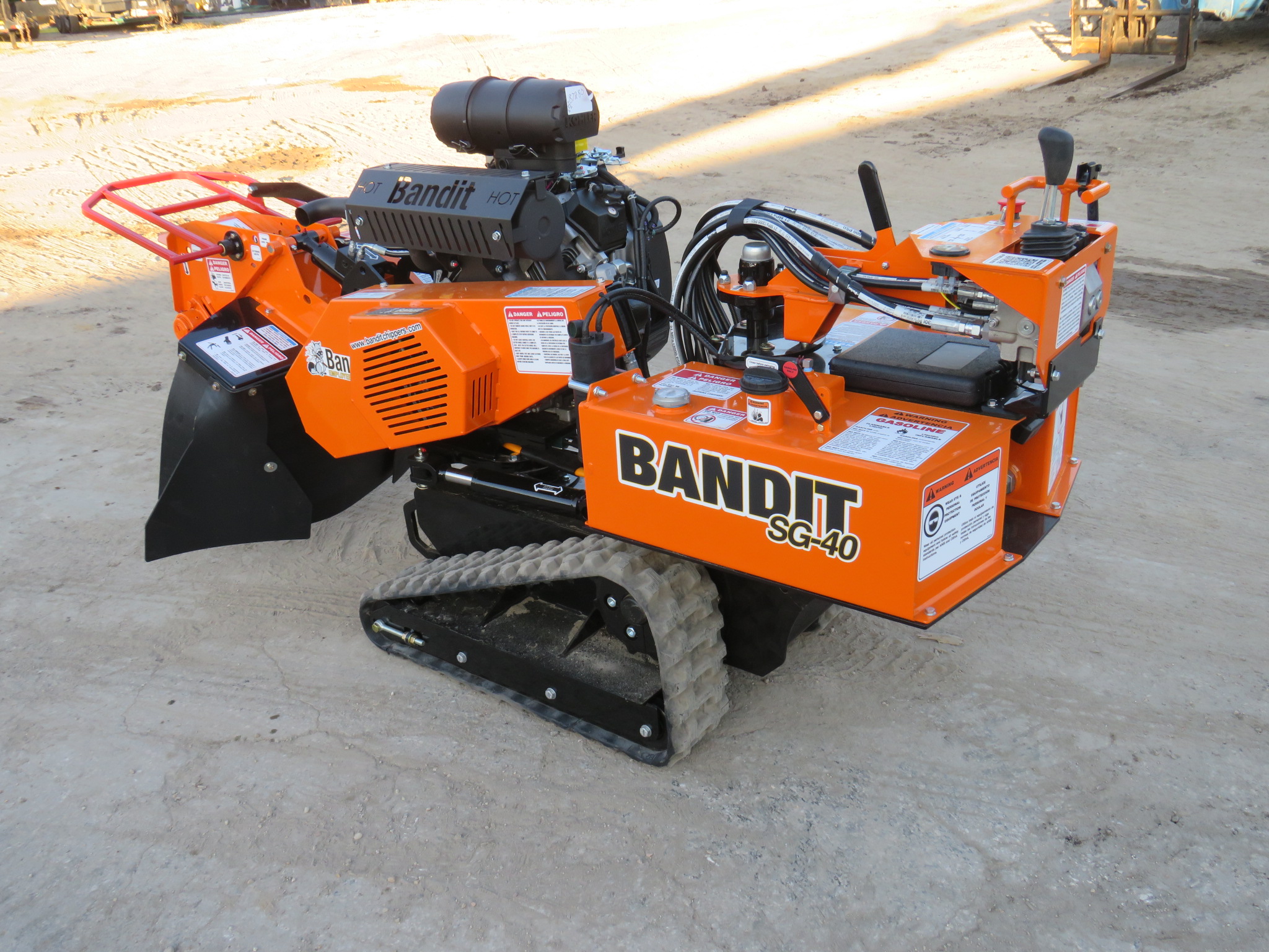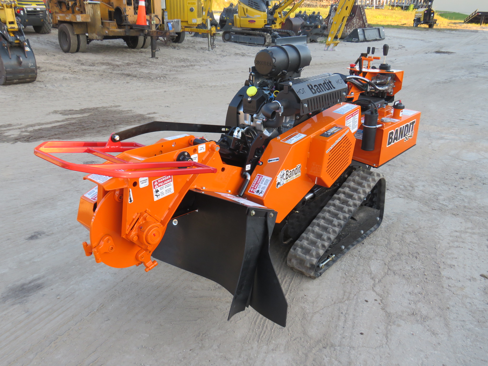 Bandit SG-40 Tracked Stump Grinder, 38hp Kohler Gas Engine, 18in Diameter x 1/2in Thick Belt Driven Green Tooth Cutter Wheel With 8 Teeth, 44in Cutting Swing, 12in Cutter Wheel Depth, 22in Cutter Height, 7-Gallon Fuel And Hydraulic Tank, Pivoting Control Panel, Painted Bandit Orange.