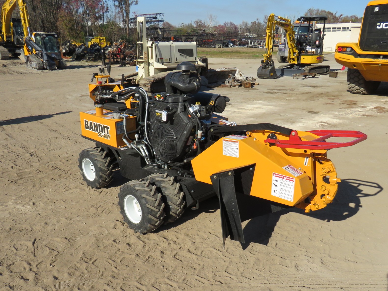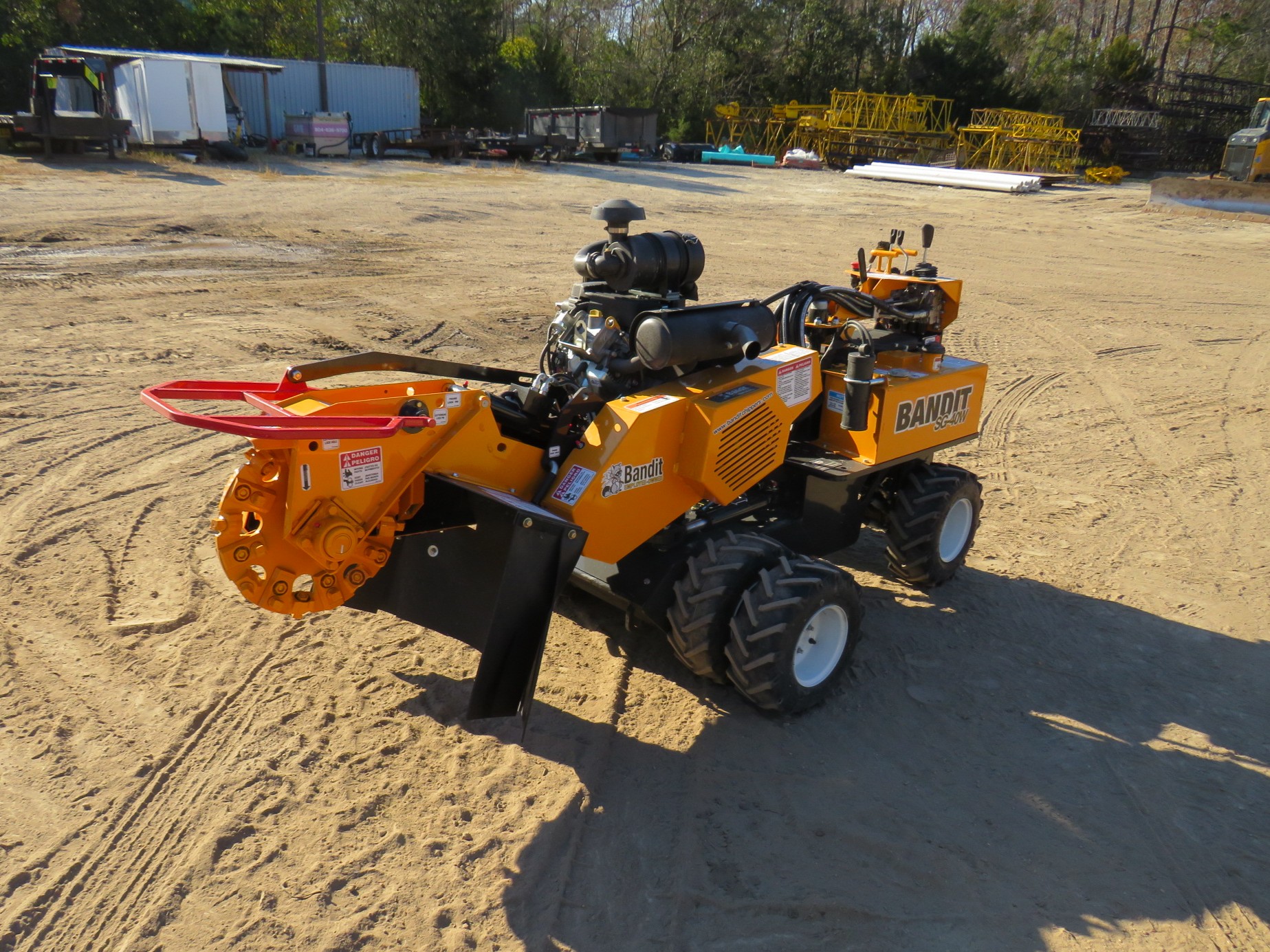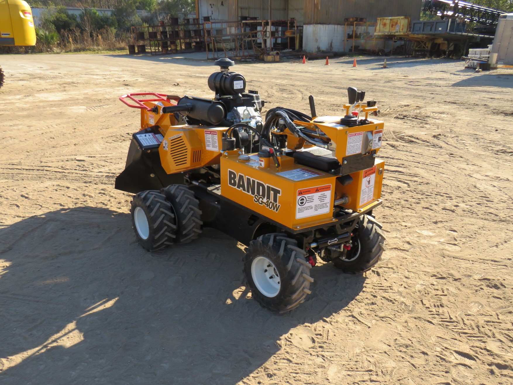 Bandit SG-40W Wheeled Stump Grinder, 40hp (EFI) Vanguard Gas Engine, 4-Wheel Drive, 47in Cutter Swing, 12in Cutting Depth, 22in Cutting Height, 33in Wide W/O Dual Wheels (49in When Dual Wheels Attached), Weighs 1,750lbs, 18in Diameter x 1/2in Thick Belt Driven New Revolution Cutter Wheel With 24 Teeth, 7gal Fuel And Hydraulic Tanks, Pivoting Control Panel, Painted Bandit Yellow.